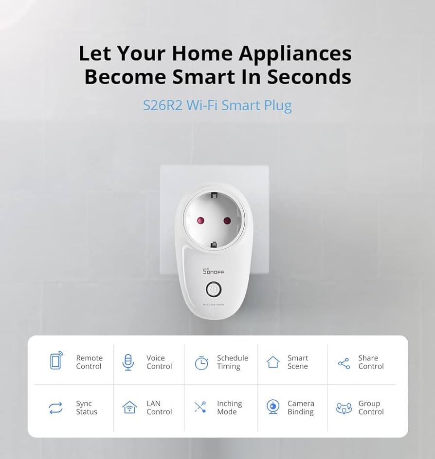 Take full control of your home devices with the Sonoff Smart Plug. This Wi-Fi–enabled plug lets you turn any ordinary appliance into a smart one. Simply connect it to your home Wi-Fi and manage it through the eWeLink app, wherever you are.