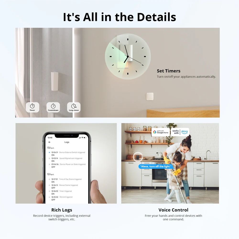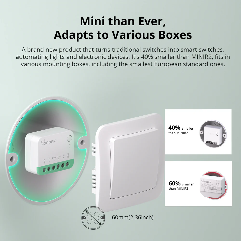 The Sonoff MINIR4M is a compact Wi-Fi smart switch designed to make any traditional wall switch or device smart. It allows you to control your lights and appliances remotely via the eWeLink app, voice assistants like Alexa, Google Assistant, and SmartThings, or even manually using your existing wall switch.